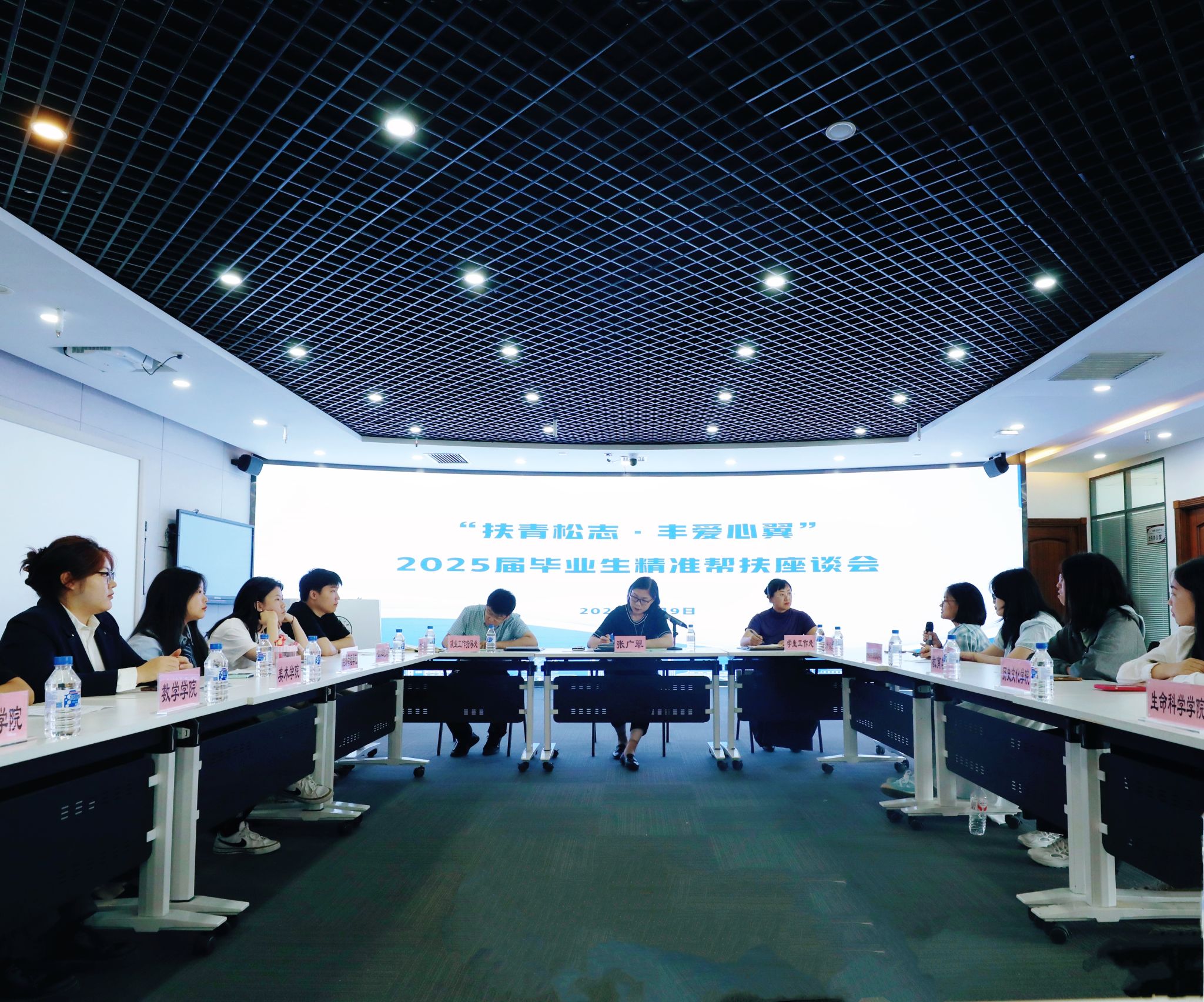就业工作指导处、学生工作处学生资助中心等部门相关人员及2025届家庭经济困难毕业生代表参加座谈会。